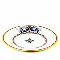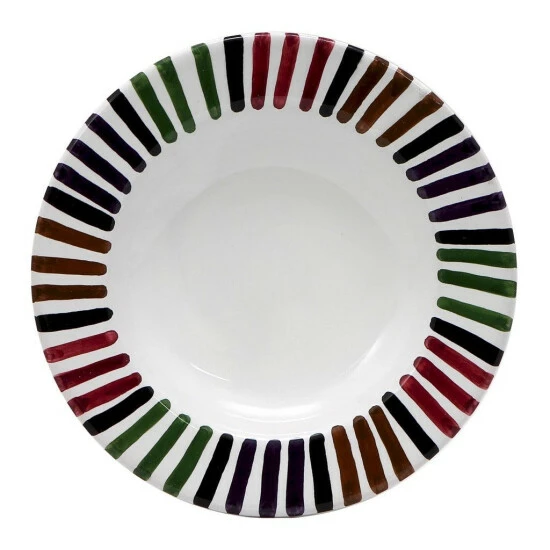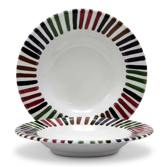 Bello collection: The Bello is hand-made and free-hand-painted in Deruta, Italy amd its’ an exclusive collection designed by Bill Goldsmith for Deruta of Italy. Through the years, this renown design has become a classic and featured, multiple times, in the best tabletop and dinnerware magazines. Its unique design comprise colored brush strokes bordering the rim in black, green, purple, brown and red.