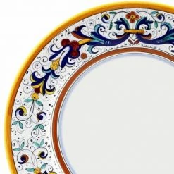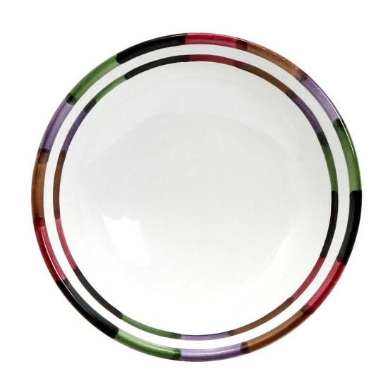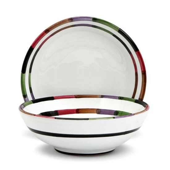 The Circo is hand-made and free-hand-painted in Deruta, Italy and it is an exclusive collection designed by Bill Goldsmith for Deruta of Italy. Through the years, this renown design has become a classic and featured, multiple times, in the best tabletop and dinnerware magazines. Its unique design comprise colored concentric circles bordering the rim in black, green, purple, brown and red.