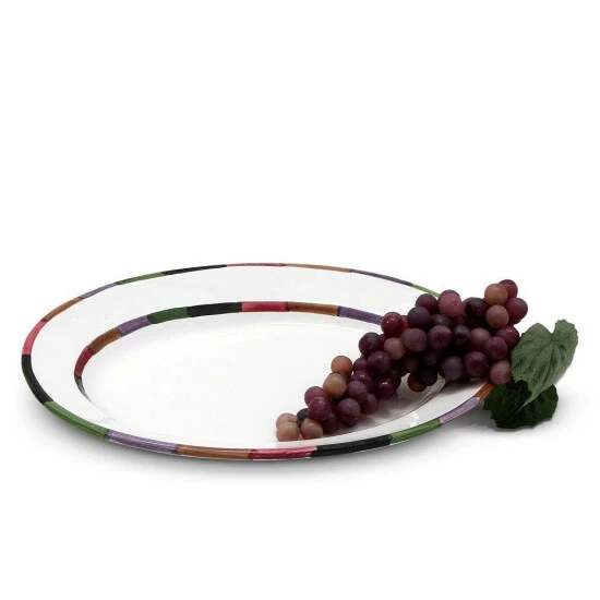 Circo collection: An exclusive product from Deruta of Italy designed by Bill Goldsmith. The Circo is hand-made and free-hand-painted in Deruta, Italy and it is an exclusive collection designed by Bill Goldsmith for Deruta of Italy. Through the years, this renown design has become a classic and featured, multiple times, in the best tabletop and dinnerware magazines. Its unique design comprise colored concentric circles bordering the rim in black, green, purple, brown and red.