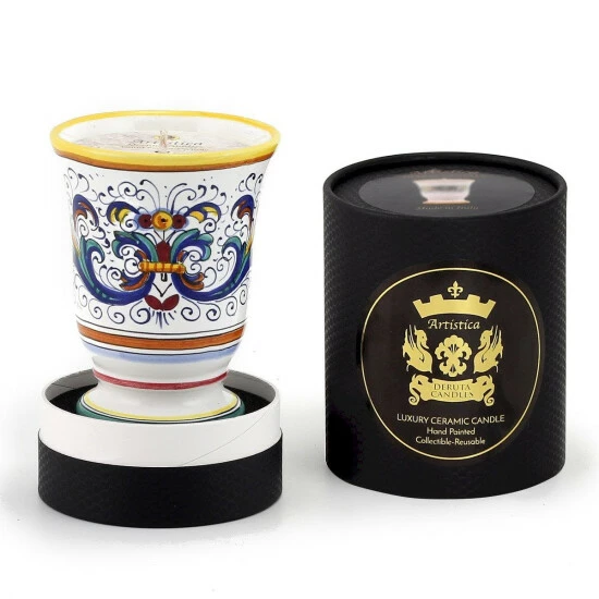 Exclusive deruta candle by artistica – hand painted in deruta – italy- Eco-friendly and non toxic soy wax- Collectible and reusable- Custom luxury tube packaging- Long burn time: approx. 50+ hours- Available unscented or in eight scents of italy fragrances- Burn the candle then, enjoy the charming fully functional and multi-purpose keepsake tumbler cup- 12 oz