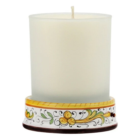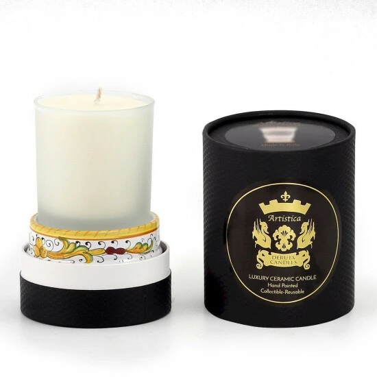 Exclusive deruta candle by artistica – hand painted in deruta – Italy.- Eco-friendly and non toxic soy wax cup candle- Collectible and reusable cup- Custom luxury tube packaging- Long burn time: approx. 60+ hours- Available unscented or in eight scents of italy fragrances- Burn the candle then, enjoy the charming fully functional and multi-purpose keepsake tumbler cup – 12 oz