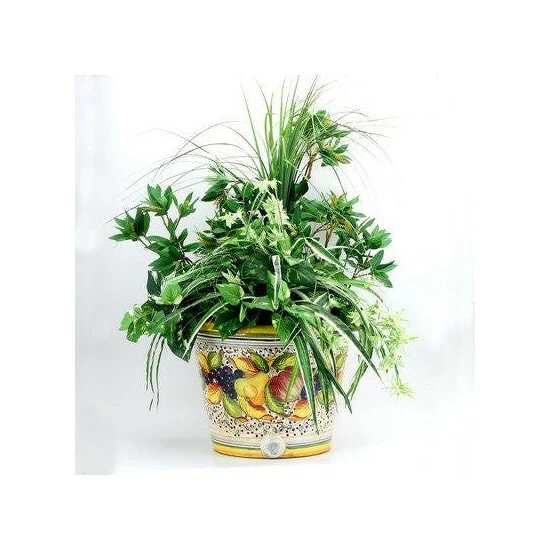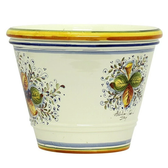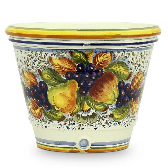 Define a genuine Tuscan look with this exclusive Artistica pattern. Masterfully hand-painted by Tuscan artisans, with festive color combinations of fruits such as Apples, Pears and Grapes, surrounded by blue scrollwork.The “Majolica Frutta” design is among the most recognizable design as genuine Tuscan home decor and the Frutta collection, with its wide assortment of truly unique vessels, has been Artistica’s top seller since 1990!