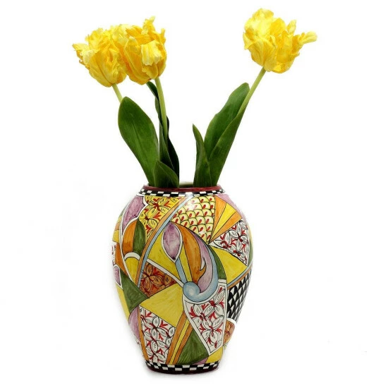 The gaudi’ collection is part of our new ‘artistica contempo’ division where we feature exclusive and trendy designs while maintaining our traditional handcrafting and hand painted feature.Expertly hand-painted in tuscany using traditional tuscan earth tones in a surprising abstract design, this collection is inspired by the style of the spanish architect, gaudi.The design features the unique interlacing of hand-painted curvilinear shapes in a burst of saturated colors. This meticulously arranged design is trimmed with a modern black and white checkered pattern.No space is left unpainted on the gaudi’ canisters and vases, with each piece fully decorated on all sides.