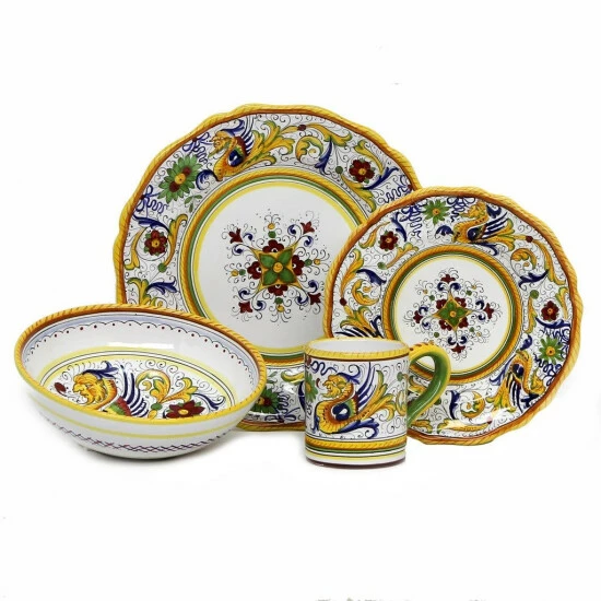 Among the most popular and enduring Italian majolica patterns, the classic ‘Raffaellesco’ traces its origin to 16th century, and the graceful arabesques of Raphael’s famous frescoes.The stylized dragon of the central motif was reputedly painted first by Raphael, a master painter and architect of the Italian High Renaissance.Raffaellesco is a benevolent deity who bestows good luck and fair winds to seagoing merchants, thus the puffs of wind steaming from the dragon’s mouth.