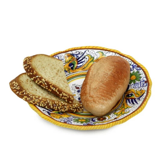 Among the most popular and enduring italian majolica patterns, the classic ‘raffaellesco’ traces its origin to 16th century, and the graceful arabesques of raphael’s famous frescoes.The stylized dragon of the central motif was reputedly painted first by raphael, a master painter and architect of the italian high renaissance.Raffaellesco is a benevolent deity who bestows good luck and fair winds to seagoing merchants, thus the puffs of wind steaming from the dragon’s mouth.