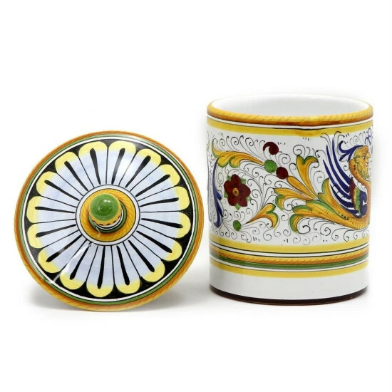 Among the most popular and enduring Italian majolica patterns, the classic ‘Raffaellesco’ traces its origin to 16th century, and the graceful arabesques of Raphael’s famous frescoes.The stylized dragon of the central motif was reputedly painted first by Raphael, a master painter and architect of the Italian High Renaissance.Raffaellesco is a benevolent deity who bestows good luck and fair winds to seagoing merchants, thus the puffs of wind steaming from the dragon’s mouth.Our Raffaellesco Deluxe feature authentic top of the line quality products, created using the original designs and patterns.