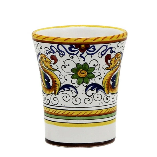 Among the most popular and enduring italian majolica patterns, the classic ‘raffaellesco’ traces its origin to 16th century, and the graceful arabesques of raphael’s famous frescoes.The stylized dragon of the central motif was reputedly painted first by raphael, a master painter and architect of the italian high renaissance.Raffaellesco is a benevolent deity who bestows good luck and fair winds to seagoing merchants, thus the puffs of wind steaming from the dragon’s mouth.