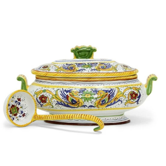 Among the most popular and enduring Italian majolica patterns, the classic ‘Raffaellesco’ traces its origin to 16th century, and the graceful arabesques of Raphael’s famous frescoes.The stylized dragon of the central motif was reputedly painted first by Raphael, a master painter and architect of the Italian High Renaissance.Raffaellesco is a benevolent deity who bestows good luck and fair winds to seagoing merchants, thus the puffs of wind steaming from the dragon’s mouth.Our Raffaellesco Deluxe feature authentic top of the line quality products, created using the original designs and patterns.