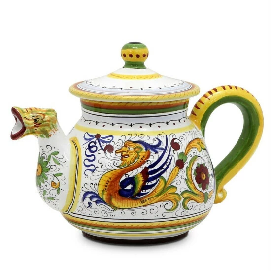 Among the most popular and enduring italian majolica patterns, the classic ‘raffaellesco’ traces its origin to 16th century, and the graceful arabesques of raphael’s famous frescoes.The stylized dragon of the central motif was reputedly painted first by raphael, a master painter and architect of the italian high renaissance.Raffaellesco is a benevolent deity who bestows good luck and fair winds to seagoing merchants, thus the puffs of wind steaming from the dragon’s mouth.