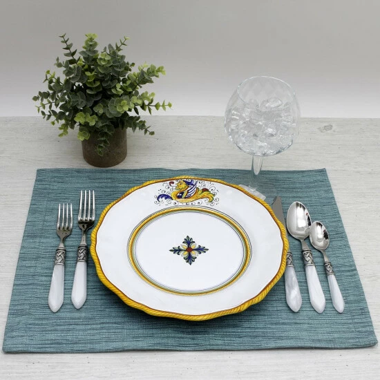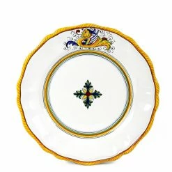 Raffaellesco lite: the ever popular raffaellesco designs simplified for a more undemanding look…Among the most popular and enduring italian majolica patterns, the classic ‘raffaellesco’ traces its origin to 16th century, and the graceful arabesques of raphael’s famous frescoes.The stylized dragon of the central motif was reputedly painted first by raphael, a master painter and architect of the italian high renaissance.Raffaellesco is a benevolent deity who bestows good luck and fair winds to seagoing merchants, thus the puffs of wind steaming from the dragon’s mouth.