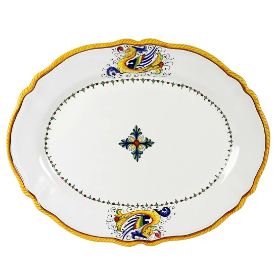 Raffaellesco Lite: the ever popular Raffaellesco designs simplified for a more undemanding look… Among the most popular and enduring Italian majolica patterns, the classic ‘Raffaellesco’ traces its origin to 16th century, and the graceful arabesques of Raphael’s famous frescoes. The stylized dragon of the central motif was reputedly painted first by Raphael, a master painter and architect of the Italian High Renaissance. Raffaellesco is a benevolent deity who bestows good luck and fair winds to seagoing merchants, thus the puffs of wind steaming from the dragon’s mouth. The Raffaellesco Lite dinnerware is the ultimate option for buyers willing to invest in something more formal and versatile. Its upscale look ensures that the set is either ideal for formal dining occasions or every day use to present any meal elegantly. Dinnerware items of Raffaellesco design are customary very richly decorated; actually, it is true of the popular thought that the more items are decorated the more they are equally better and valuable, however, with the minimal current trend, our mission is to create a much simpler look at a reduced price while still maintaining the original Deruta feeling.