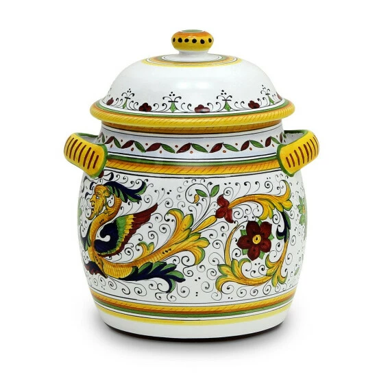 Among the most popular and enduring italian majolica patterns, the classic ‘raffaellesco’ traces its origin to 16th century, and the graceful arabesques of raphael’s famous frescoes.The stylized dragon of the central motif was reputedly painted first by raphael, a master painter and architect of the italian high renaissance.Raffaellesco is a benevolent deity who bestows good luck and fair winds to seagoing merchants, thus the puffs of wind steaming from the dragon’s mouth.Our raffaellesco deluxe feature authentic top of the line quality products, created using the original designs and patterns.