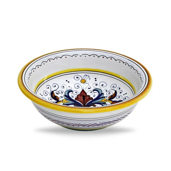 Ricco deruta collection: this is the true original version of the most celebrated deruta’s design, which traces its origins to the sixteenth century.Masterfully hand painted with the original royal blue, yellow gold, and emerald green, subtle color creating a brilliant elegance to bring royal elegance to your table.