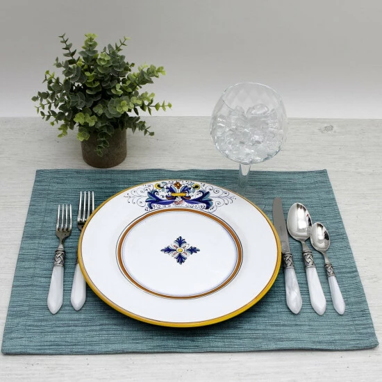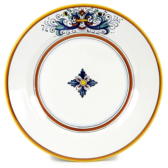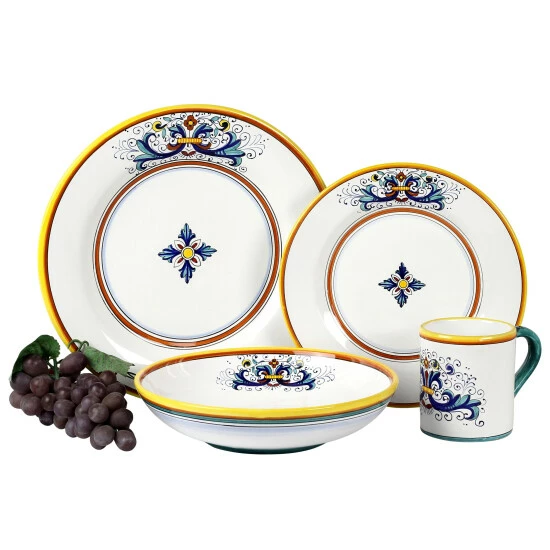 Ricco deruta lite: the ever popular ricco deruta design simplified for a more undemanding look. The ricco deruta lite dinnerware is the ultimate option for buyers willing to invest in something more formal and versatile. Its upscale look ensures that the set is either ideal for formal dining occasions or every day use to present any meal elegantly. Dinnerware items of ricco deruta design are customary very richly decorated; actually, it is true of the popular thought that the more items are decorated the more they are equally better and valuable, however, with the minimal current trend, our mission is to create a much simpler look at a reduced price while still maintaining the original deruta feeling. Artistica’s depiction of the traditional ricco deruta, is the true original version of the most celebrated deruta’s design, which traces its origins to the sixteenth century raffaello’s and perugino’s frescos. The ricco deruta is deruta’s most renowned design featuring colors such as royal blue, yellow gold, and emerald green, all traditional renaissance era colors that bring royal elegance to your table. Our ricco deruta lite collection features authentic hand painted top of the line quality products, created using the original designs and patterns. Your full satisfaction is guaranteed on these stunning products.
