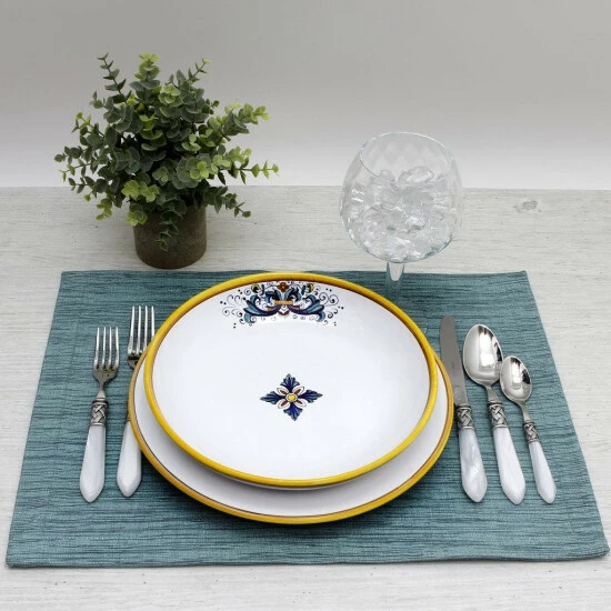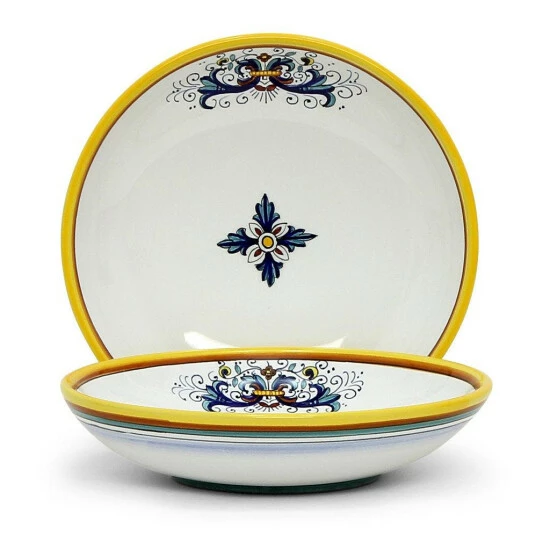 Ricco deruta lite: the ever popular ricco deruta design simplified for a more undemanding look. the ricco deruta lite dinnerware is the ultimate option for buyers willing to invest in something more formal and versatile. Its upscale look ensures that the set is either ideal for formal dining occasions or every day use to present any meal elegantly.Dinnerware items of ricco deruta design are customary very richly decorated; actually, it is true of the popular thought that the more items are decorated the more they are equally better and valuable, however, with the minimal current trend, our mission is to create a much simpler look at a reduced price while still maintaining the original deruta feeling. Artistica’s depiction of the traditional ricco deruta, is the true original version of the most celebrated deruta’s design, which traces its origins to the sixteenth century raffaello’s and perugino’s frescos. The ricco deruta is deruta’s most renowned design featuring colors such as royal blue, yellow gold, and emerald green, all traditional renaissance era colors that bring royal elegance to your table. Our ricco deruta lite collection features authentic hand painted top of the line quality products, created using the original designs and patterns. Your full satisfaction is guaranteed on these stunning products.