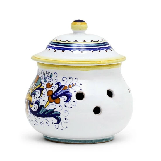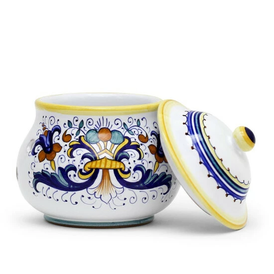 This product is part of the renown ricco deruta collection. This is the true original version of the most celebrated deruta’s design, which traces its origins to the sixteenth century. Masterfully hand painted with the original royal blue, yellow gold, and emerald green; traditional renaissance era colors to bring royal elegance to your table.