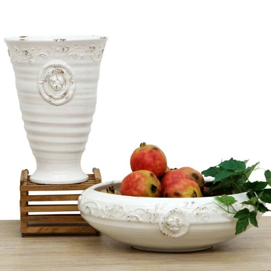 Introducing our all new Scavo Rigata collection featuring fully hand thrown cachepot vases accented with bass-relief volute renaissance design reproduced by our master Tuscan artisans!Artistica’s Scavo look and finish is renown in our industry as the most realistic, even the experts will have to look twice to recognize the antiqued glazing imparted by the new ceramic technique used on this new collection as each piece is hand-finished, intentionally distressed to achieve the well-used look of a much older piece.Fully glazed inside and out, they hold water and are great for arranging flowers or as tabletop.
