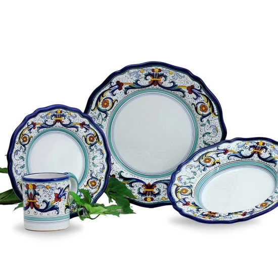 Vecchia Deruta Collection: (Old Deruta) – The authentic richer and more formal version of the renowned ricco deruta pattern. Scalloped rim plates featuring the traditional royal blue, yellow gold, and emerald green creating a brilliant elegance to bring royal elegance to your table. The vecchia deruta is a design inspired by the frescoes of the master renaissance artist raphael.